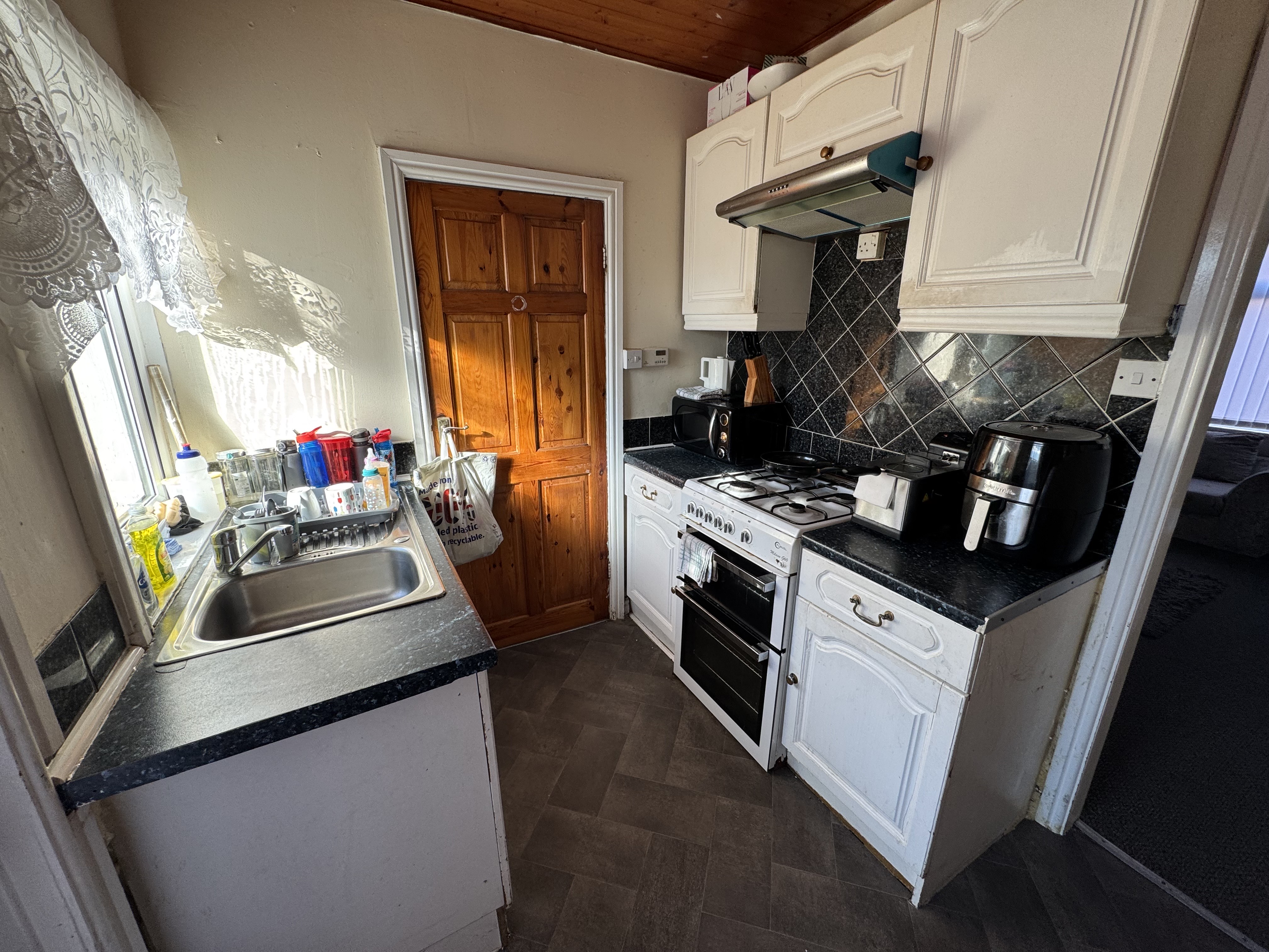 Dining Kitchen. 3.38m x 2.13m, UPVC Double glazed door and window to rear, range of wall and base units, gas oven point, stainless steel sink unit.