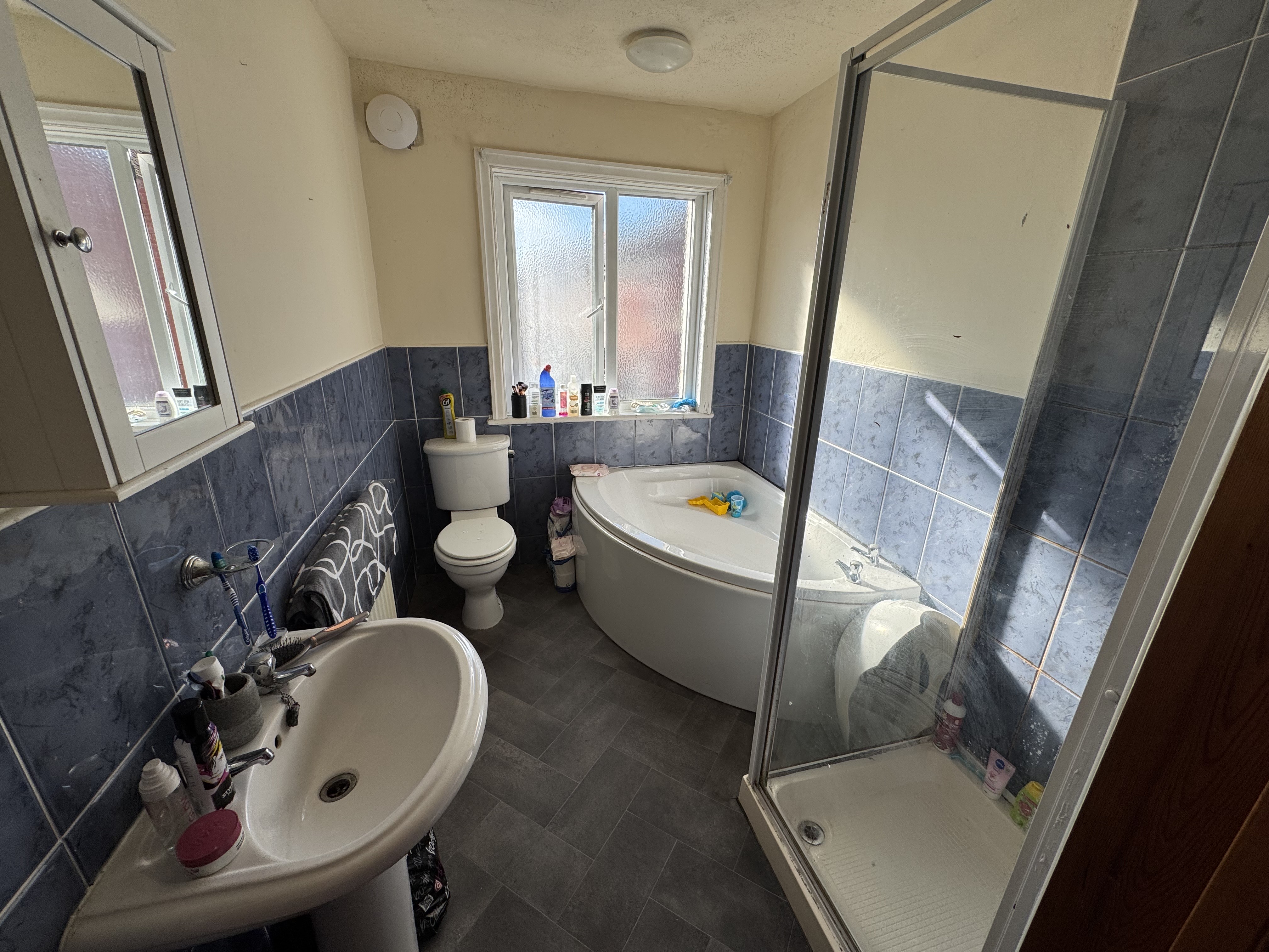 Bathroom. 3.34m x 1.96m, UPVC Double glazed window to rear, bath, walk in shower cubicle, WC, wash hand basin.