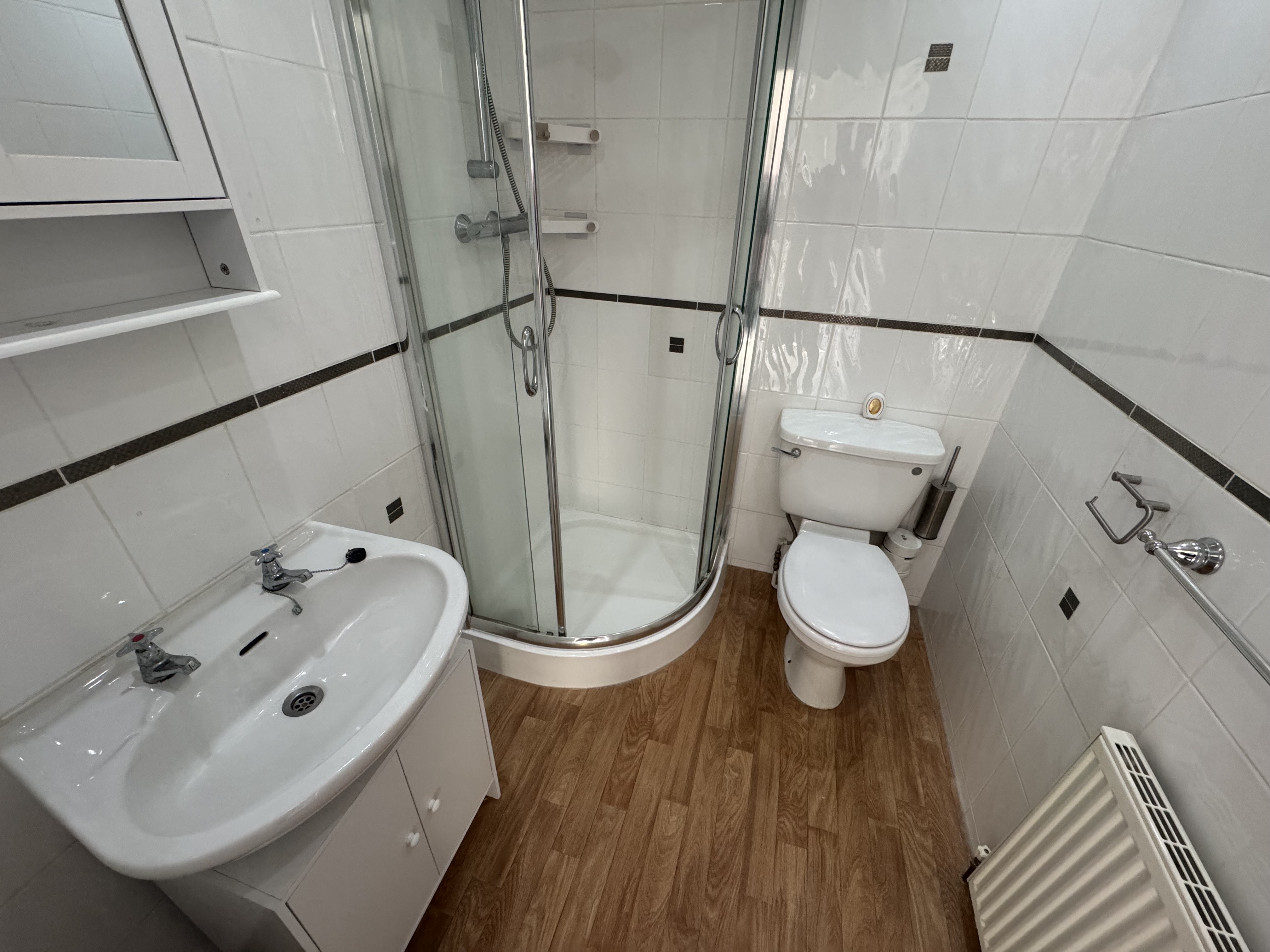 Shower Room. Gas central heating radiator, walk in shower cubicle, WC, wash hand basin.