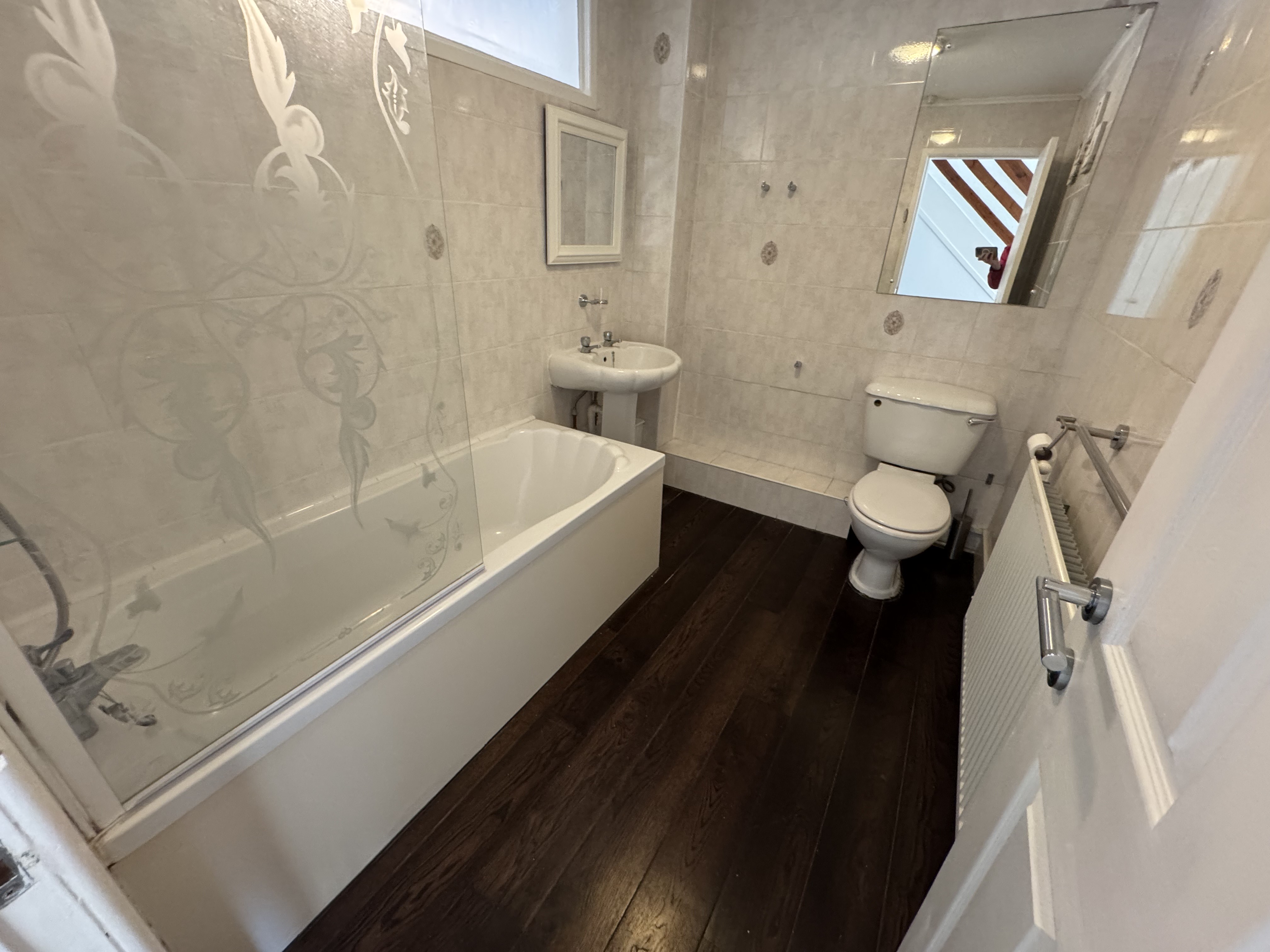 Ground Floor Bathroom. Bath with over bath shower, low flush WC, wash hand basin.