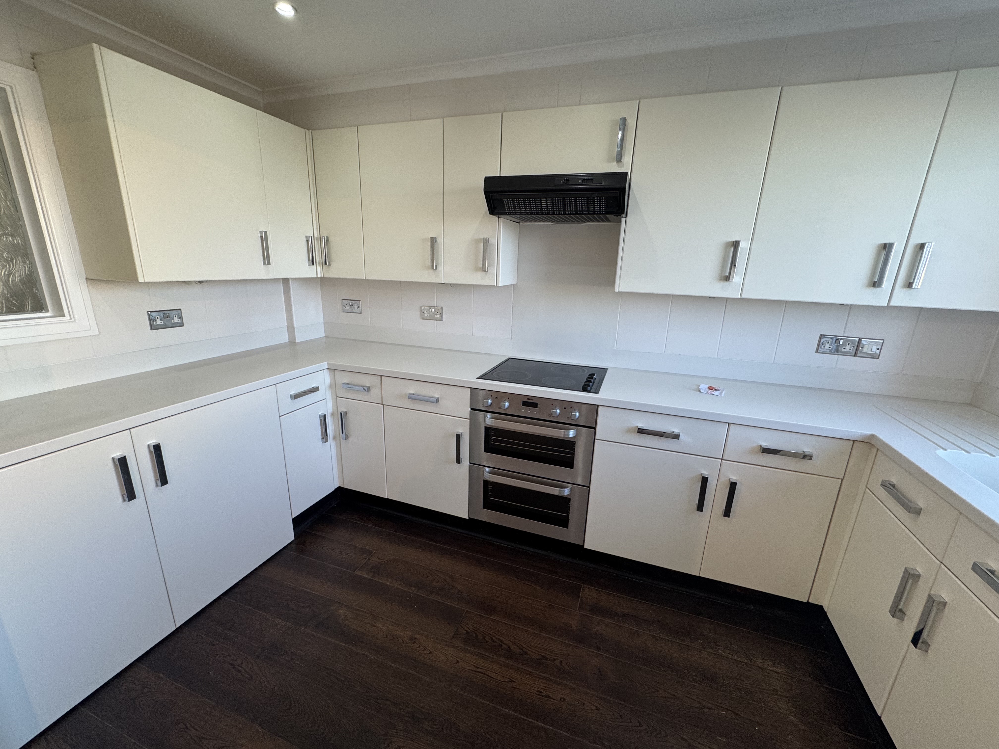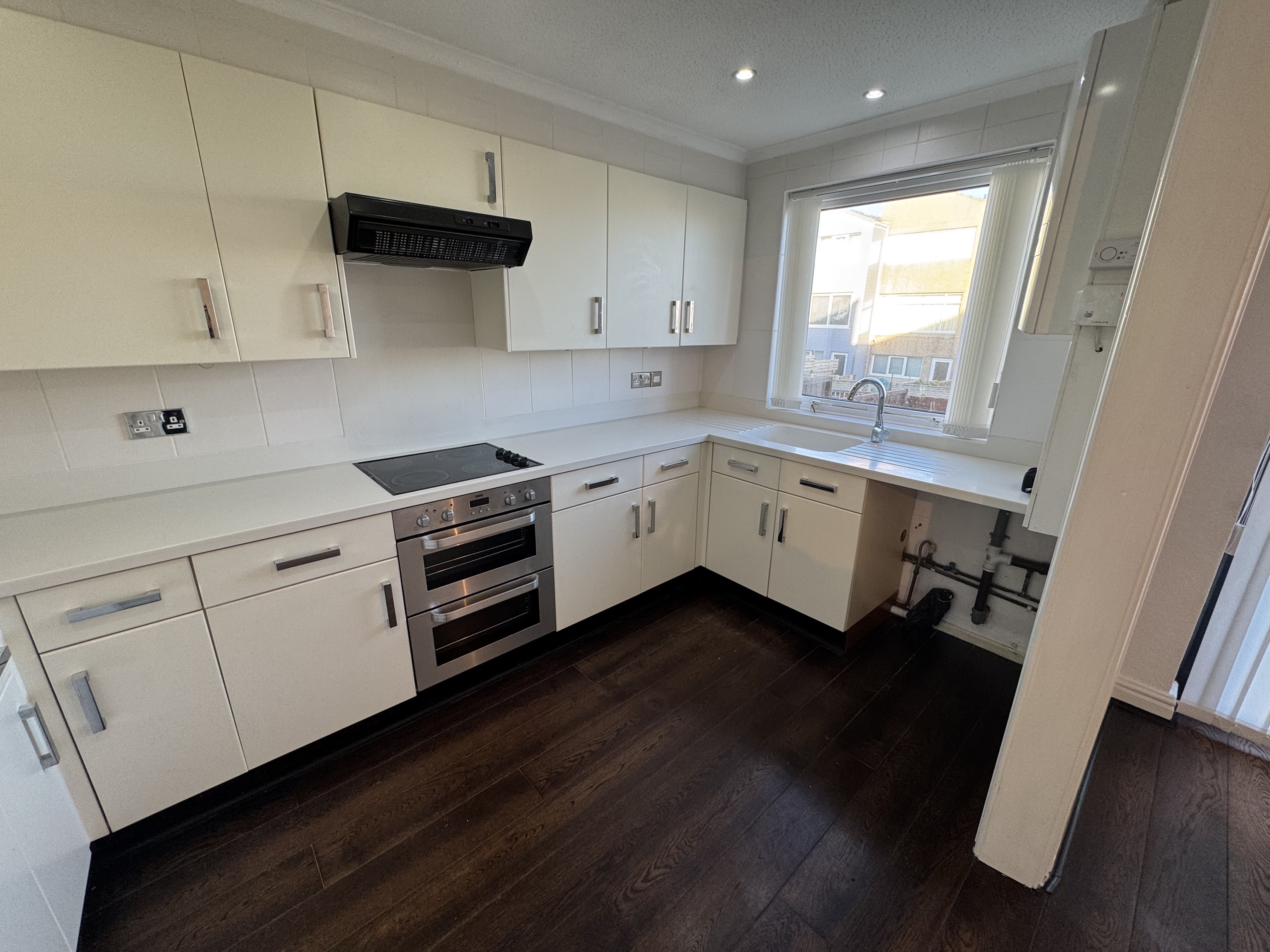 Kitchen. 3.60m x 2.20m, UPVC Double glazed window, range of wall and base units, electric oven and hob, inset sink unit, plumbing for washing machine.