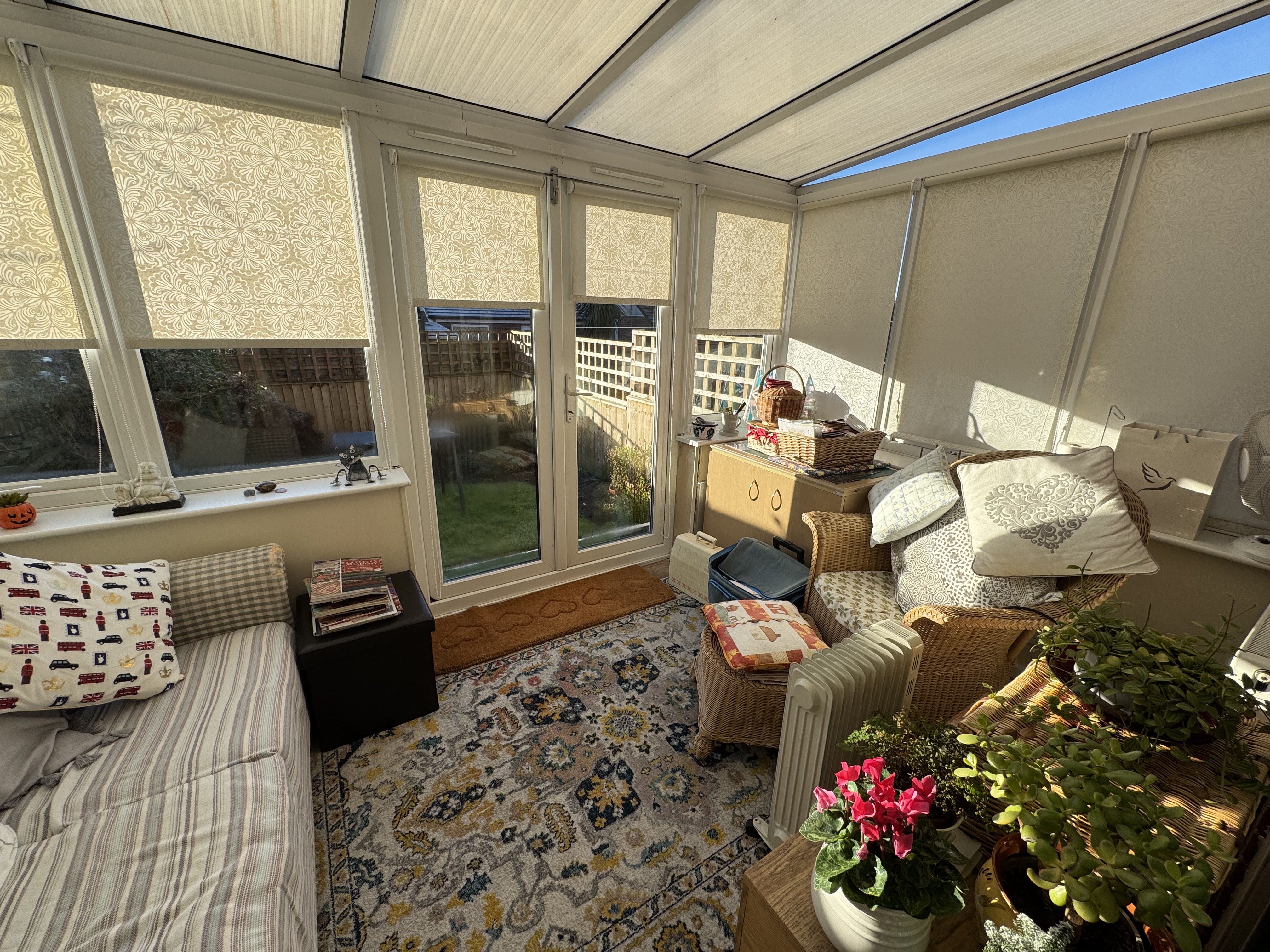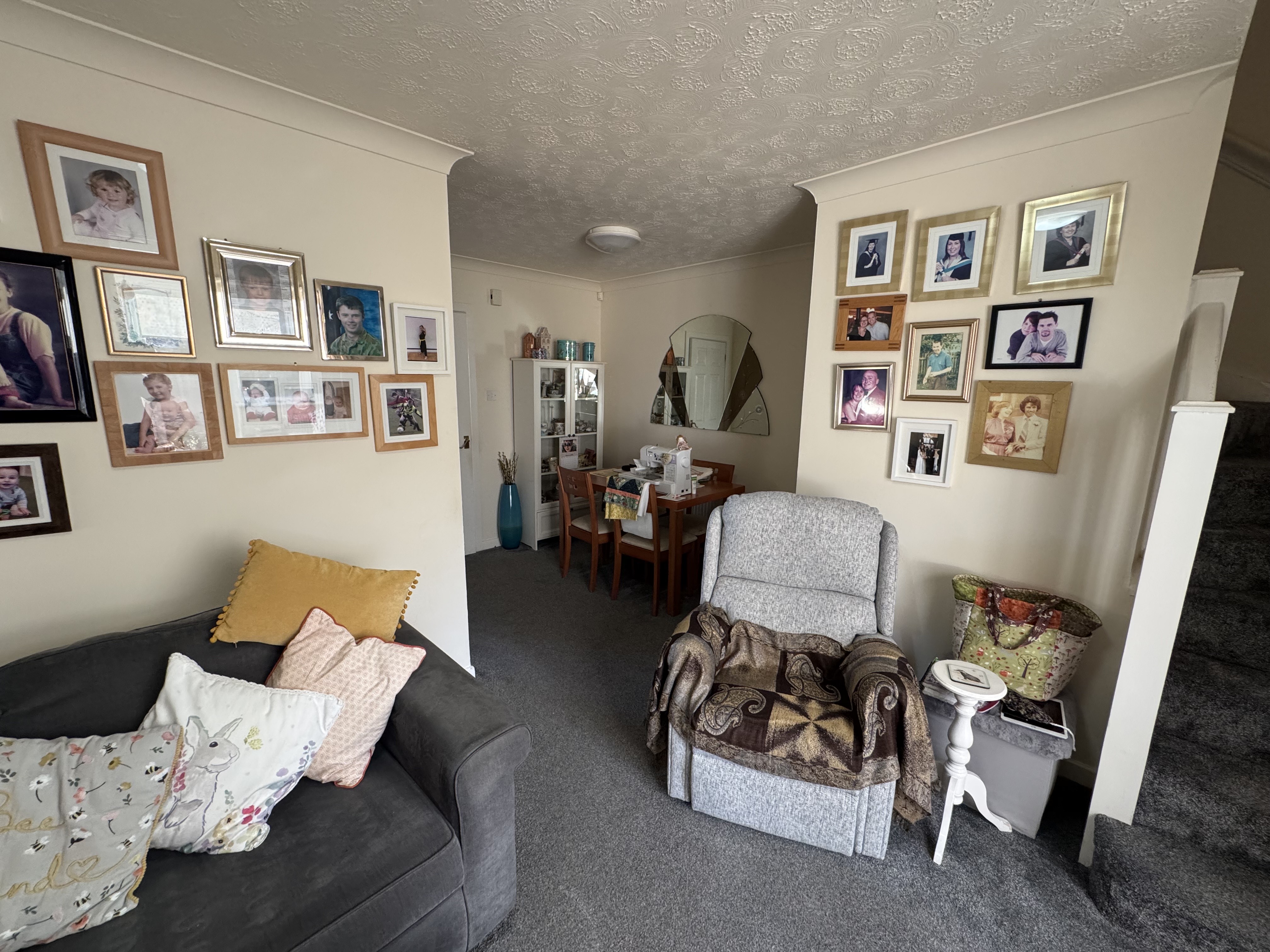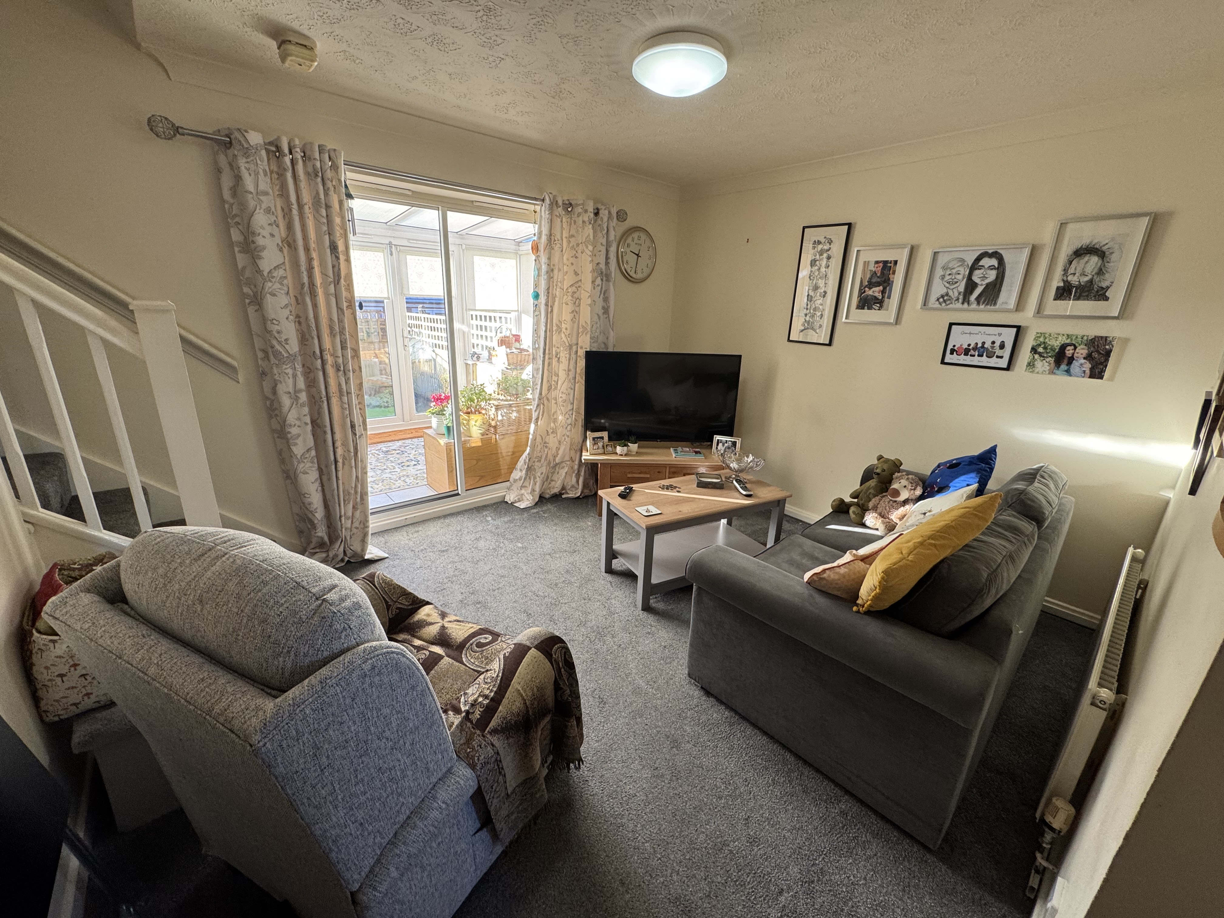 Lounge and Dining Area. 4.85m x 4.74m maximum dimensions, Patio doors to conservatory, 2 x gas central heated radiators, stairs to first floor, under stairs storage.