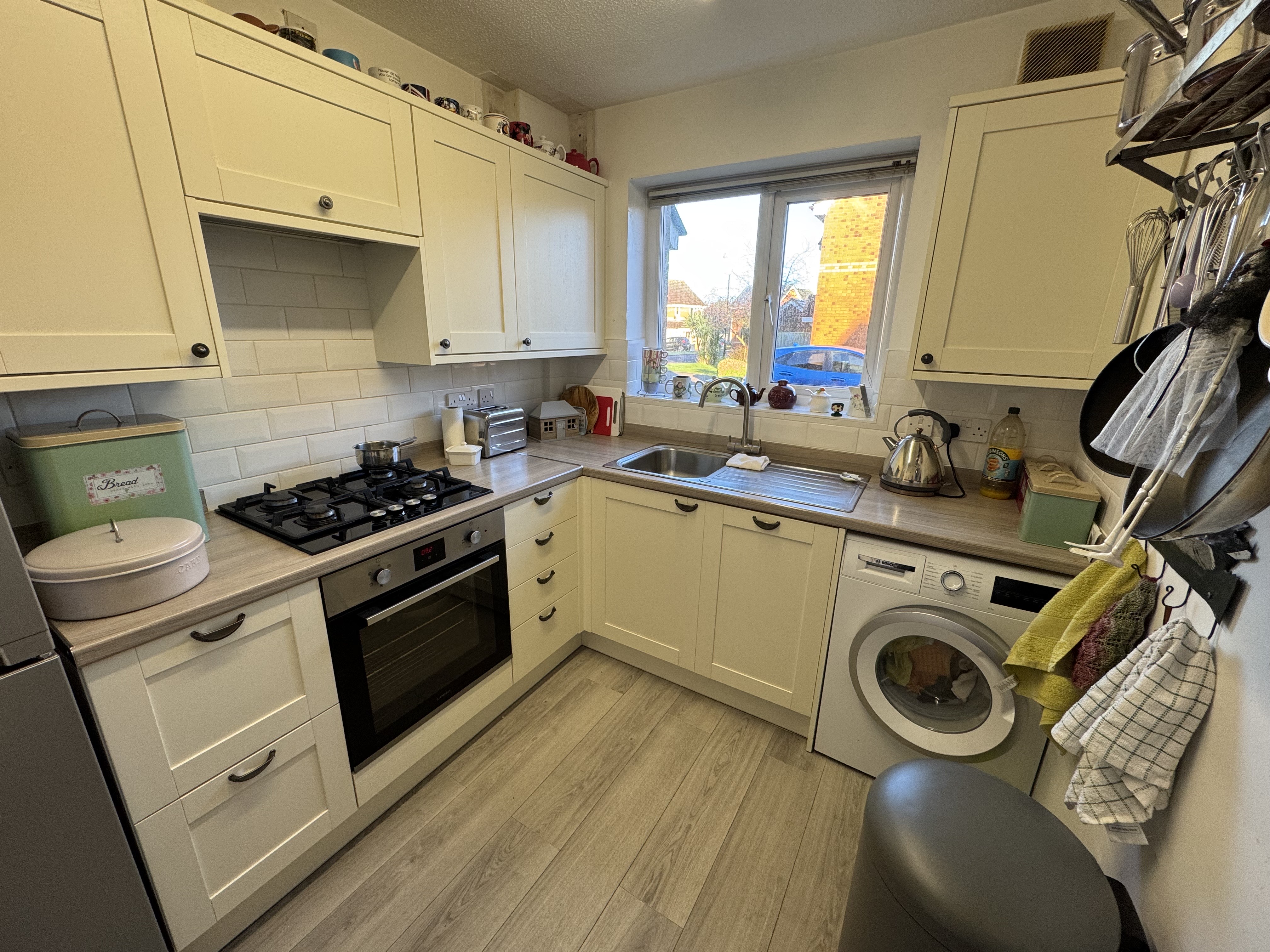 Kitchen. 2.64m x 2.20m, UPVC Double glazed window to front, gas central heated radiator, range of wall and base units, integral electric oven and gas hob, stainless steel sink unit, plumbing for washing machine, wood laminate flooring.