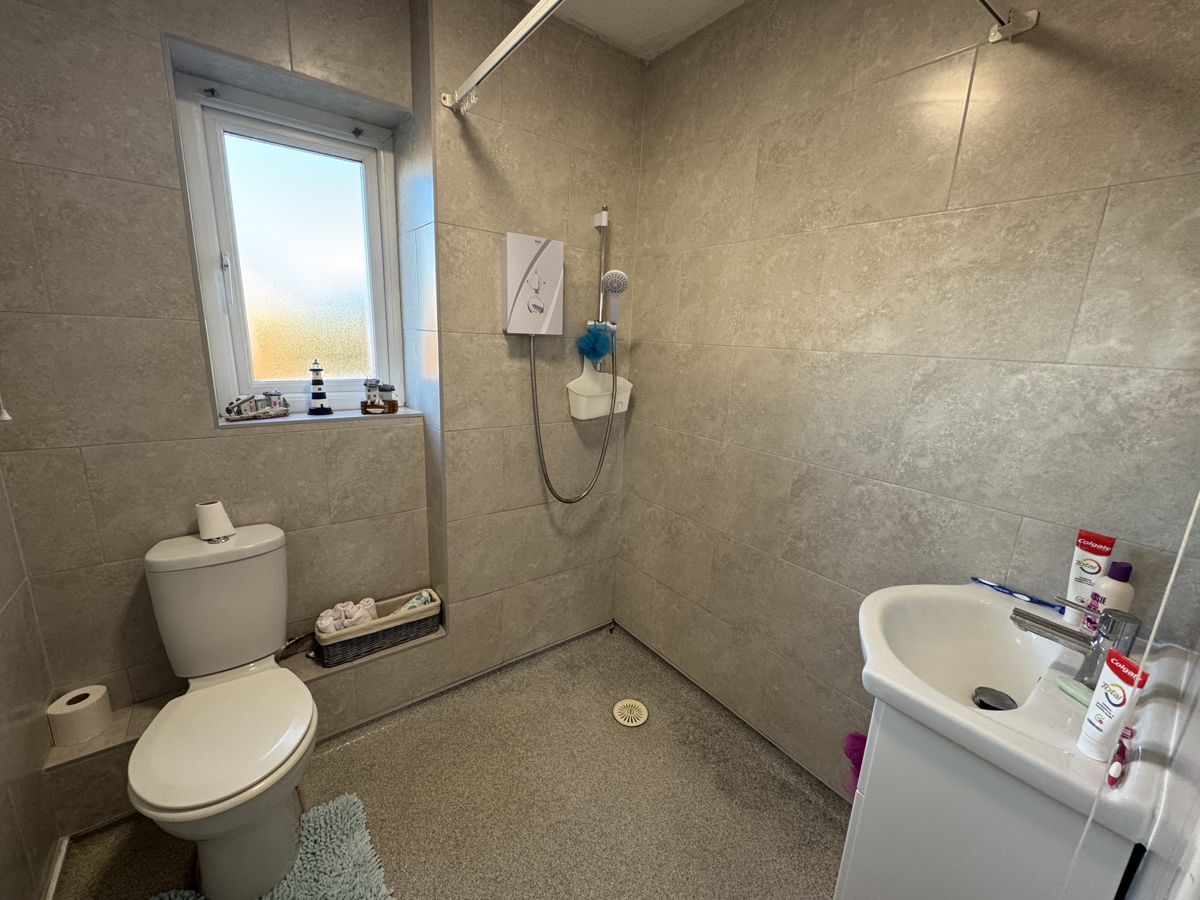 Wet Room. UPVC Double glazed window to rear, heated towel rail, open shower area, WC, wash hand basin.
