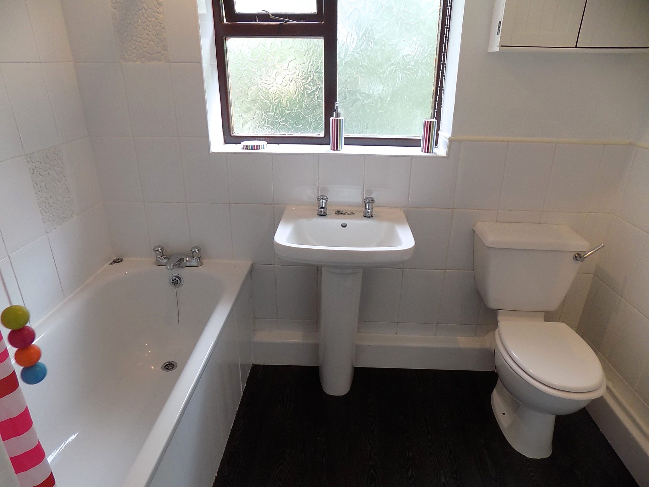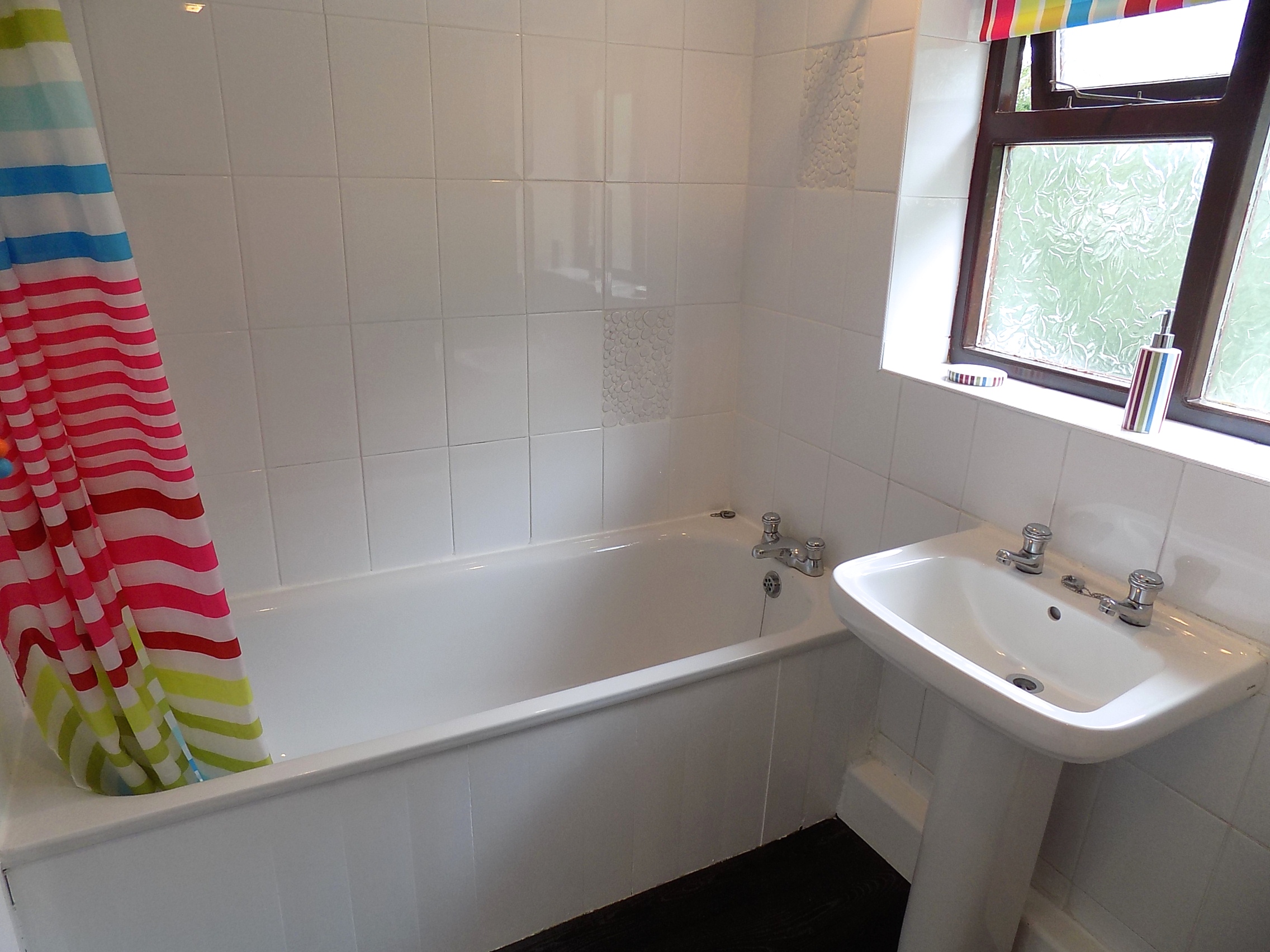 Bathroom. 2.35m x 1.61m, Double glazed window to rear, bath with over bath shower, low flush WC, wash hand basin.