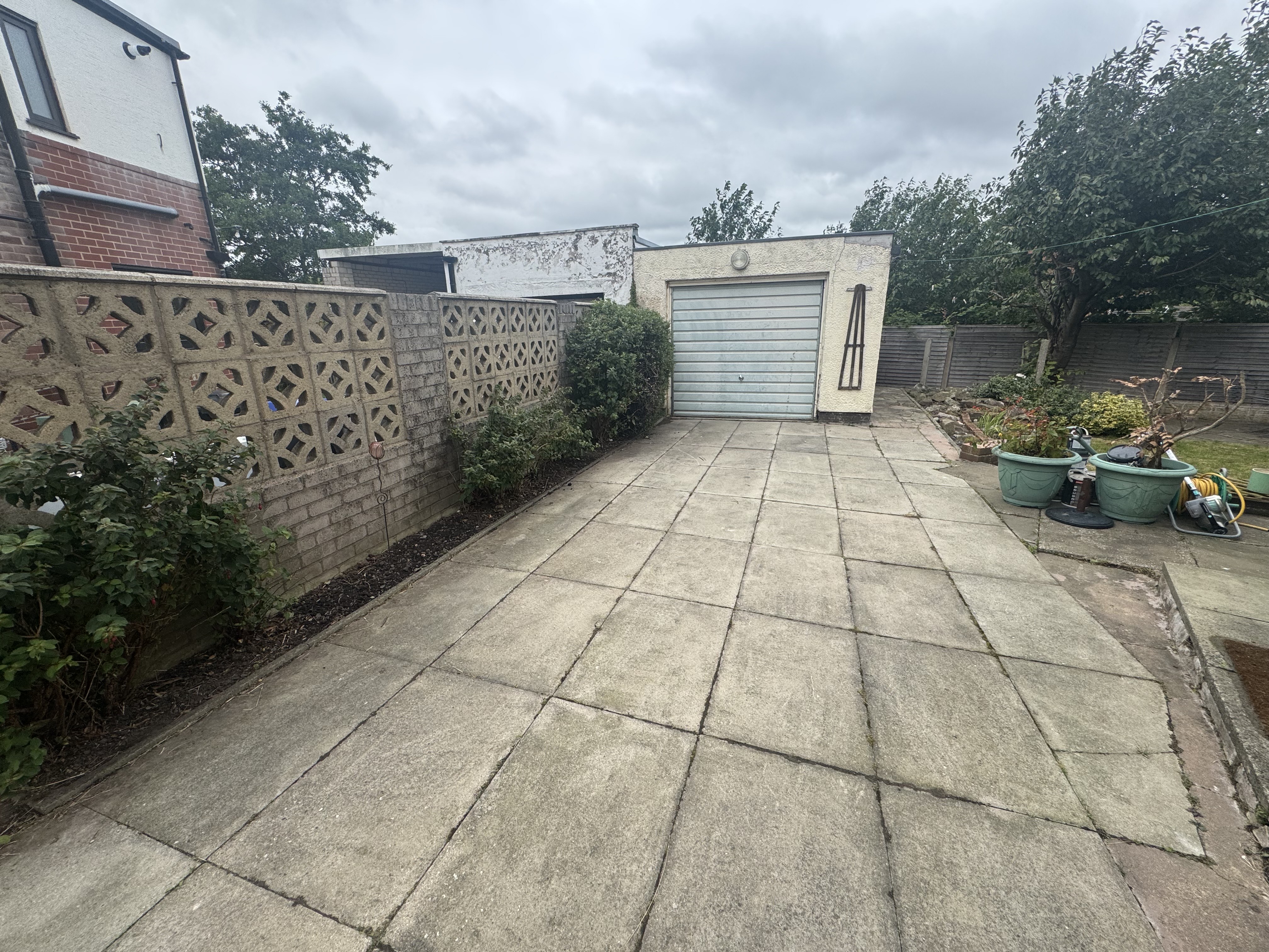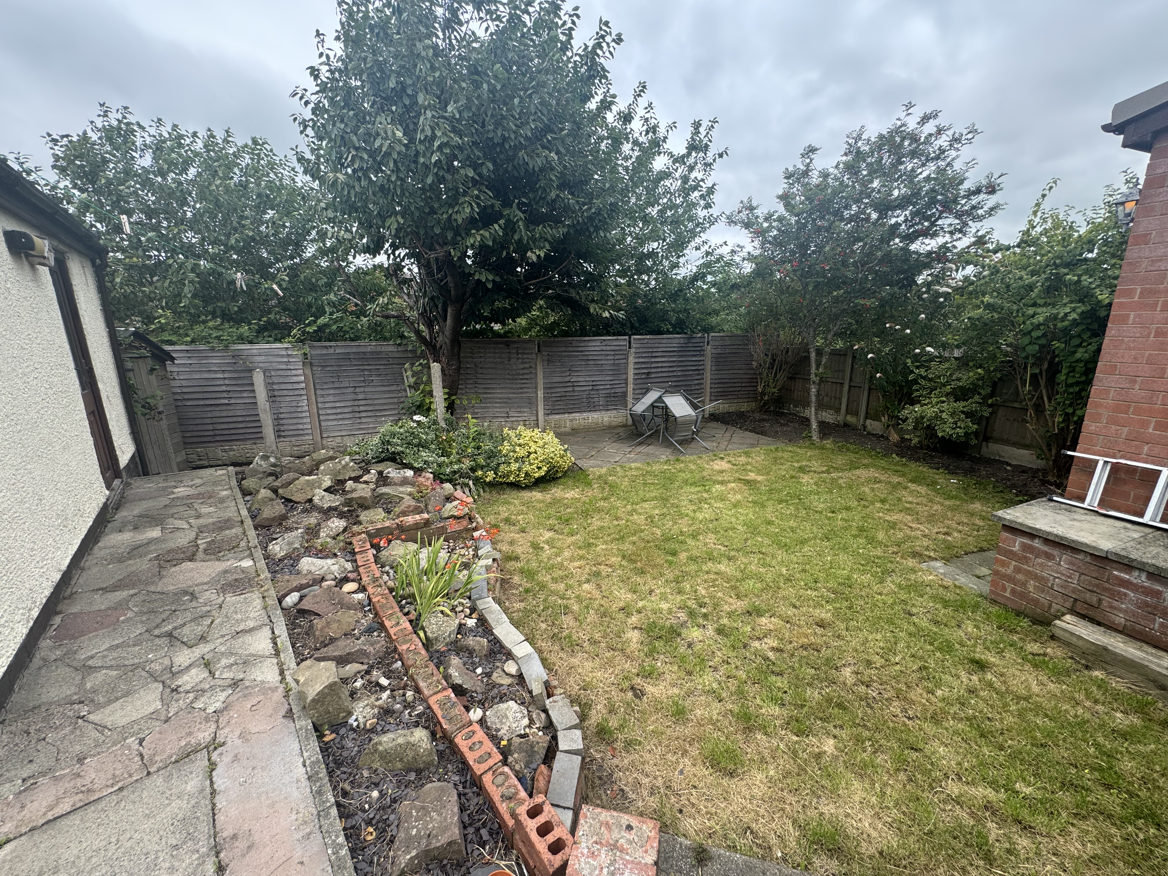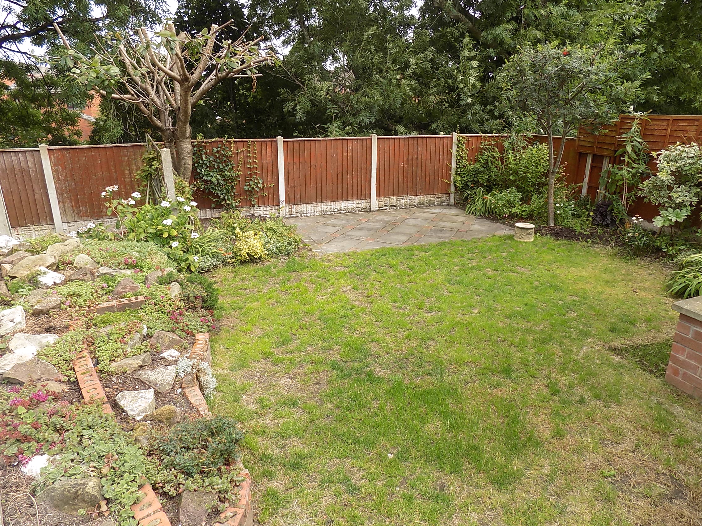 Private rear garden with paved patio, lawed area, established borders and garden shed.