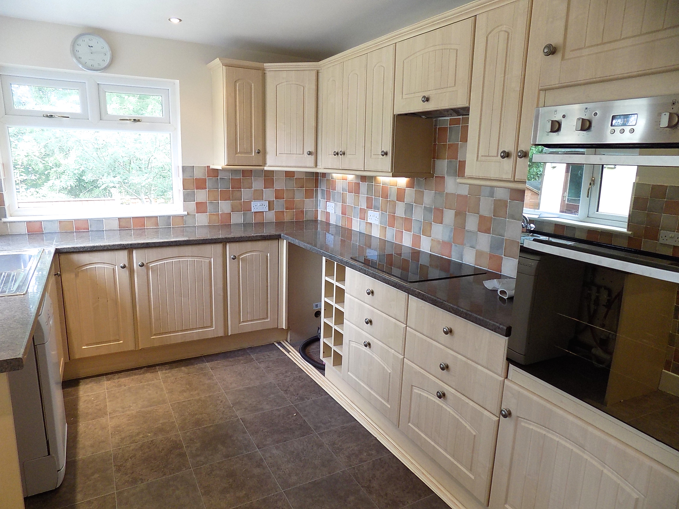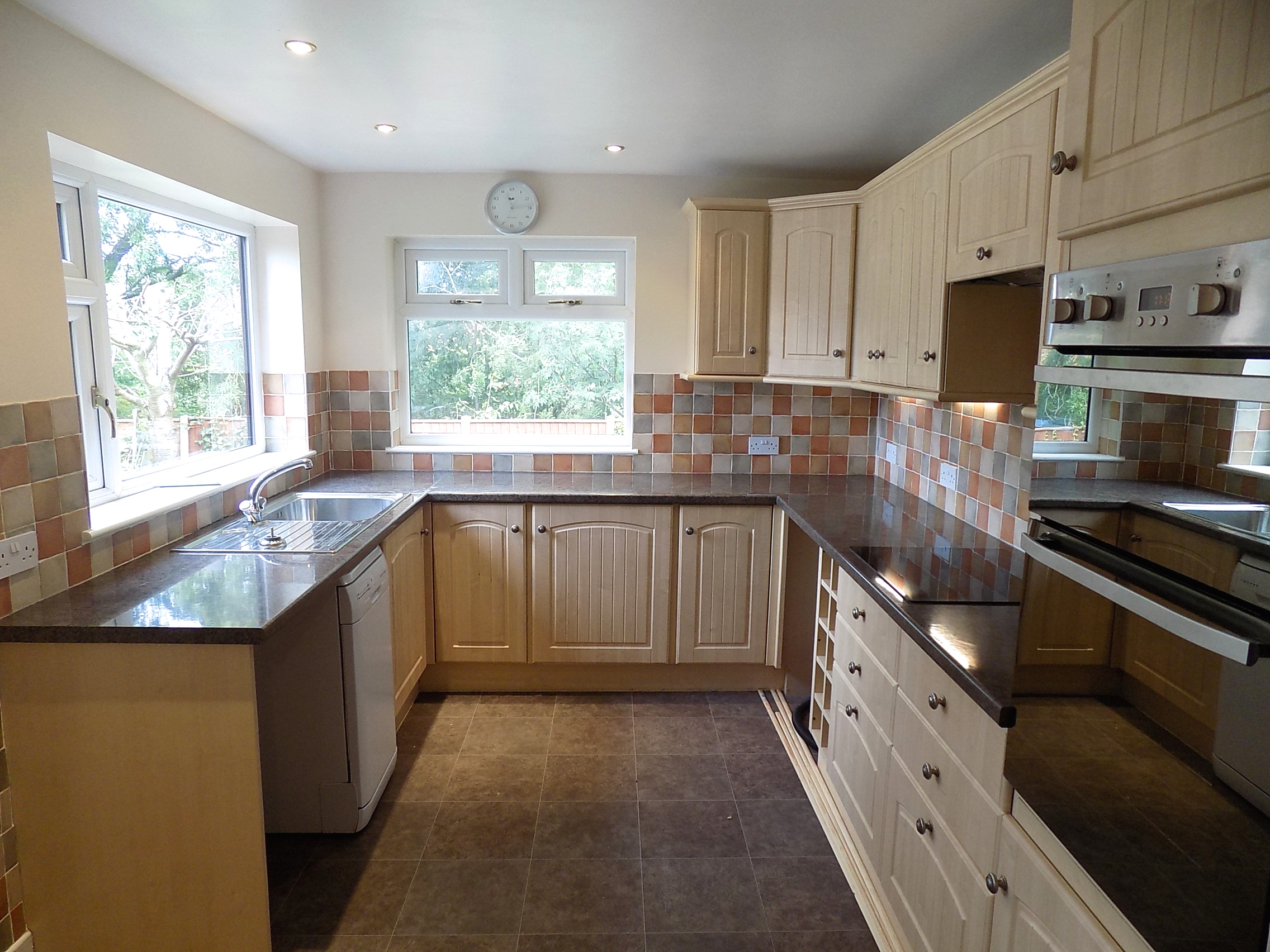 Kitchen. 3.67m x 2.68m, UPVC Double glazed doors to side, UPVC Double glazed window to rear and side, range of modern wall and base units with worktops over, integral electric oven and grill, halogen hob with extractor over, integral freezer, dishwasher, plumbed for automatic washing machine, part tiled walls.