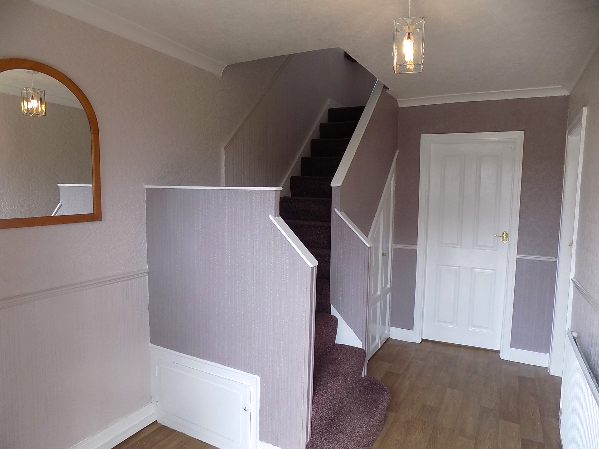 Entrance Hallway. Double glazed window to front, gas central heating radiator, stairs to first floor, 2 x under stairs storage spaces.
