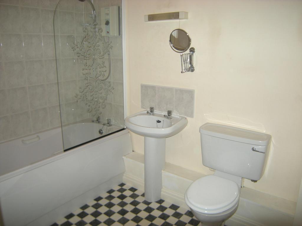 Bathroom. 2.65m x 1.85m, Wall mounted heater, bath with over bath shower, low flush WC, wash hand basin, extractor fan.