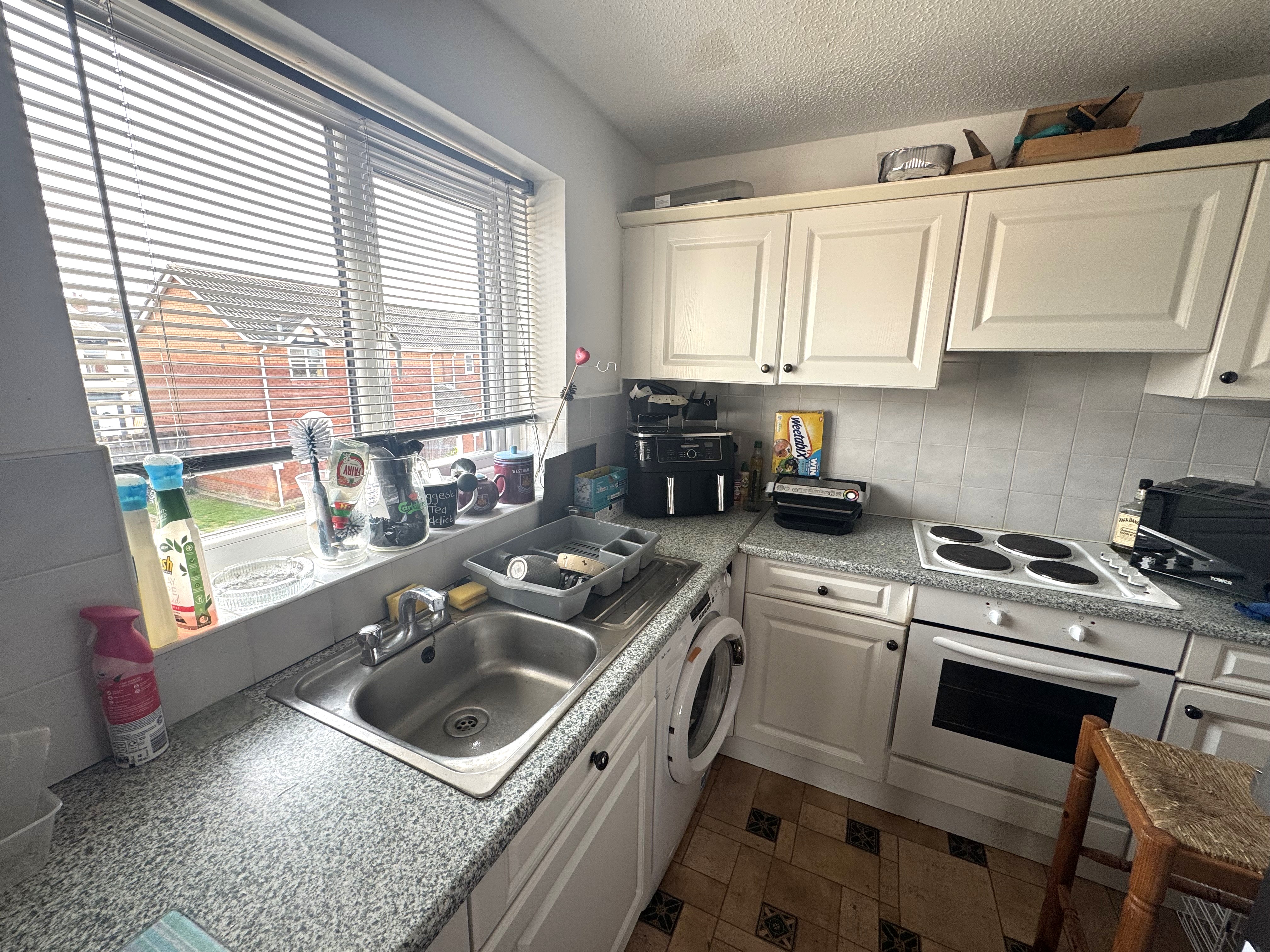 Kitchen. 2.61m x 2.25m, Double glazed window to side, wall mounted heater, range of wall and base units with worktops over, stainless steel sink, integral electric cooker and hob.