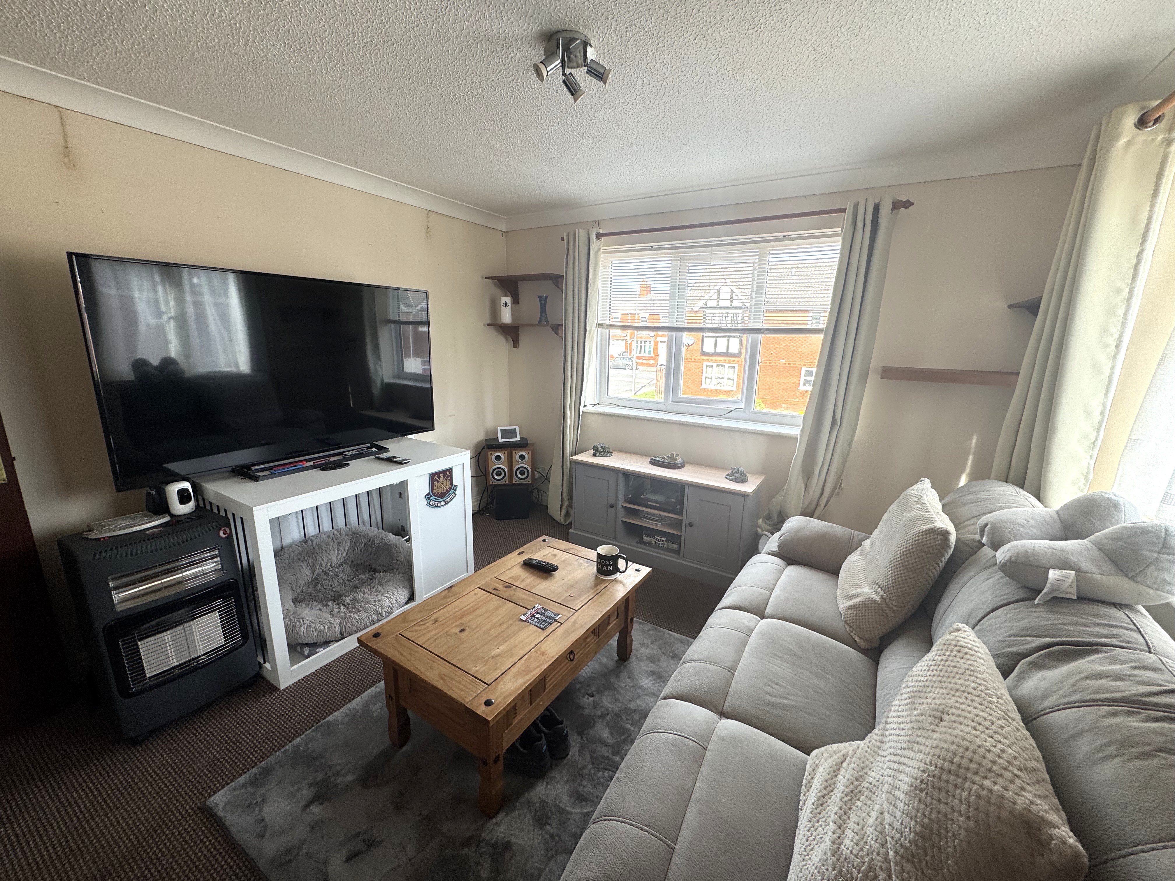Lounge. 3.61m x 3.37m, Double glazed window to front and side, storage heater, TV point.