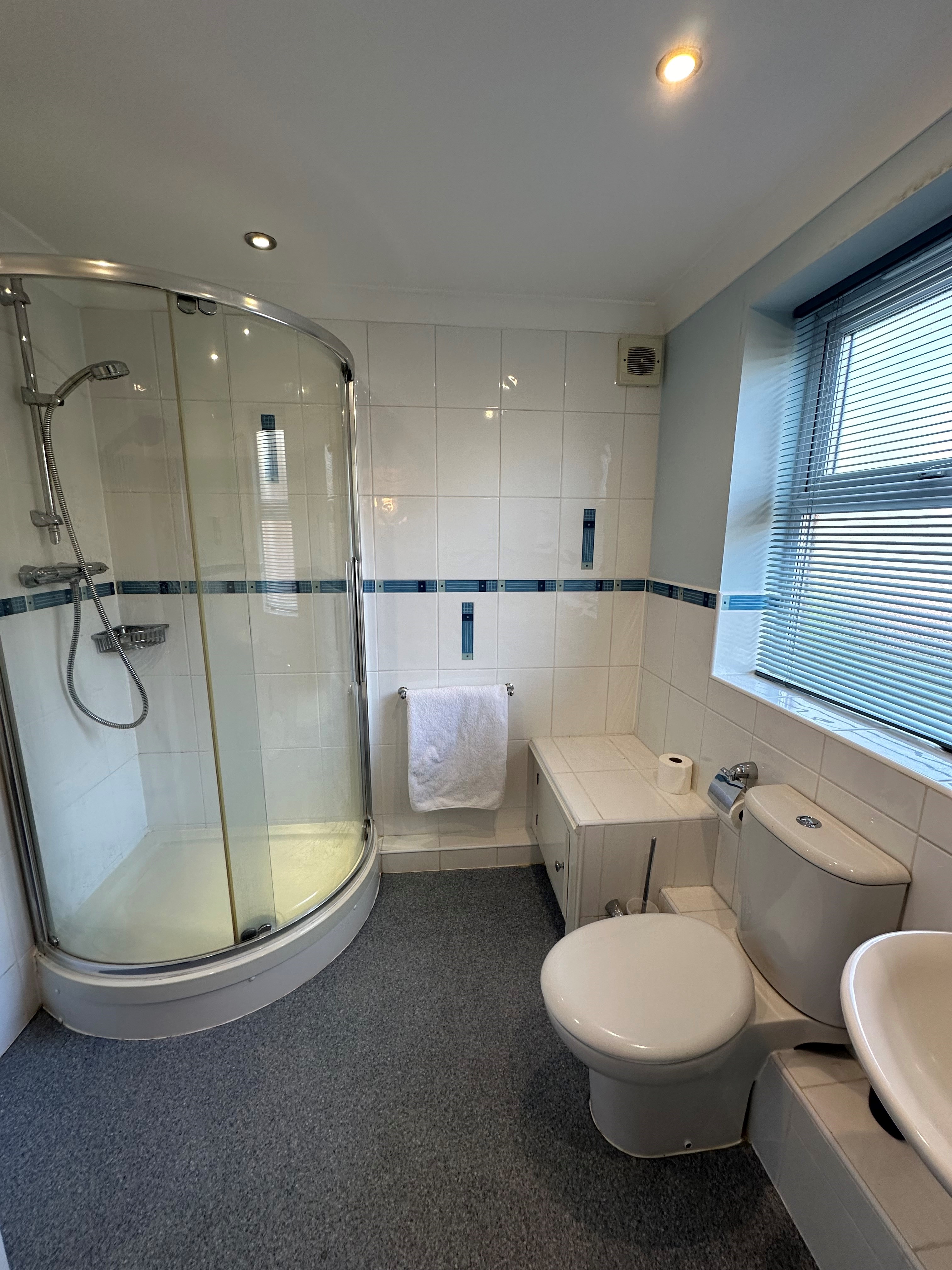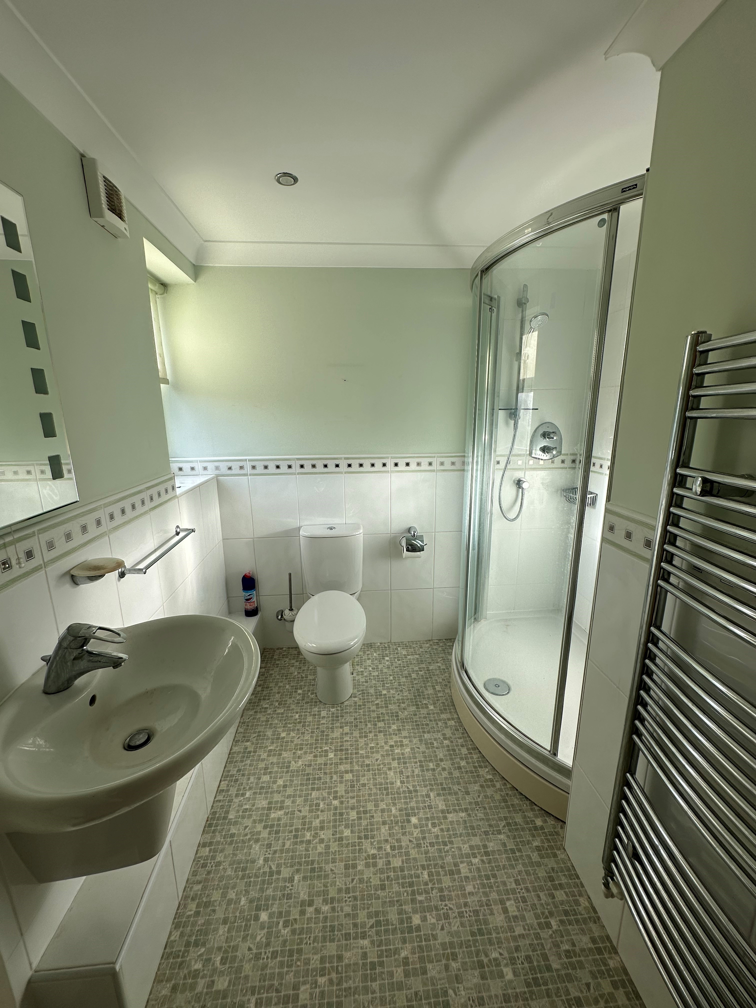 En Suite. UPVC Double glazed window to rear, gas central heated radiator, heated towel rail, walk in shower cubicle, WC, wash hand basin, large storage cupboard.