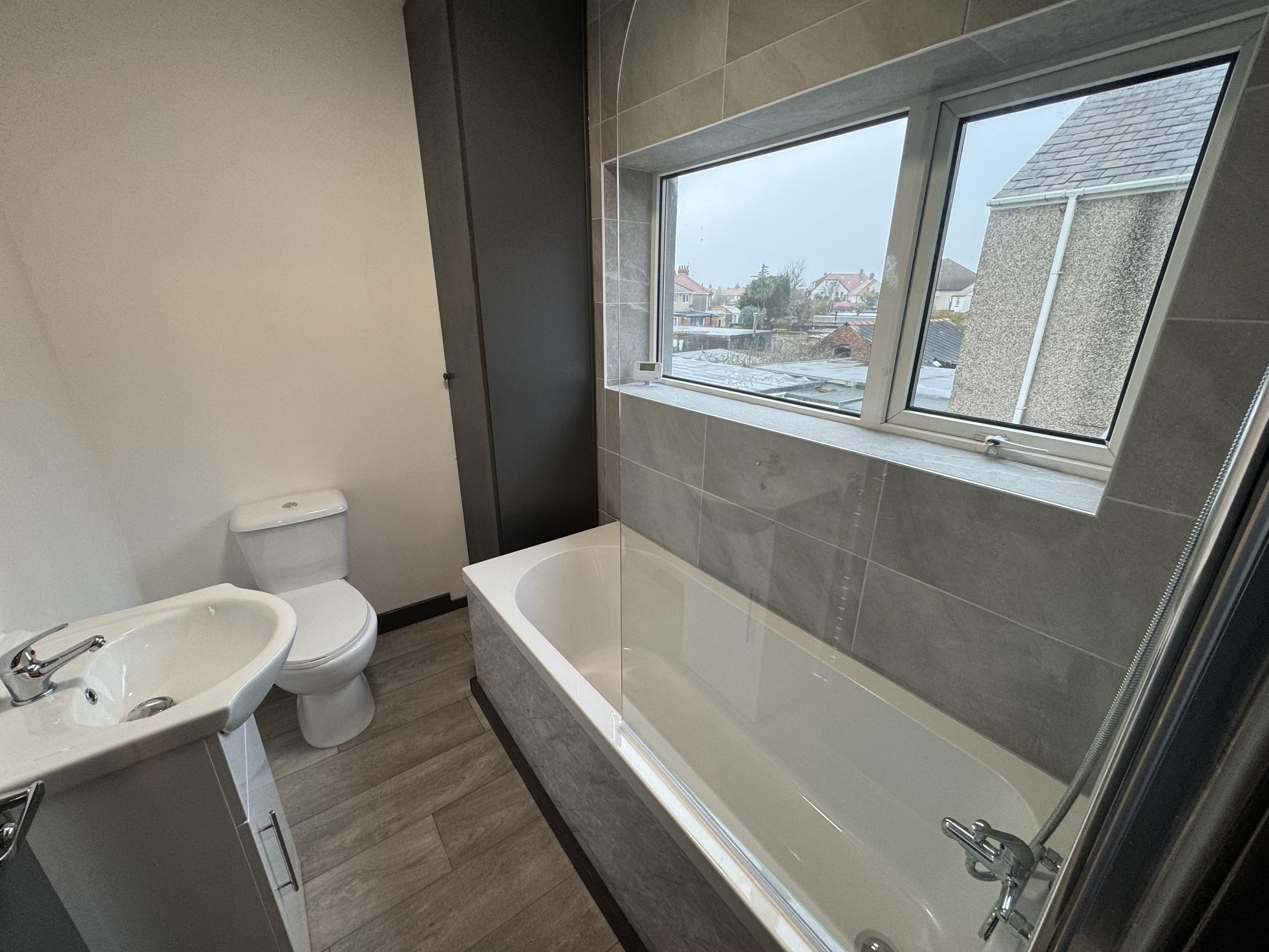 Bathroom. UPVC double glazed window to side, heated towel rail, bath with over bath shower, WC, wash hand basin, wood flooring.