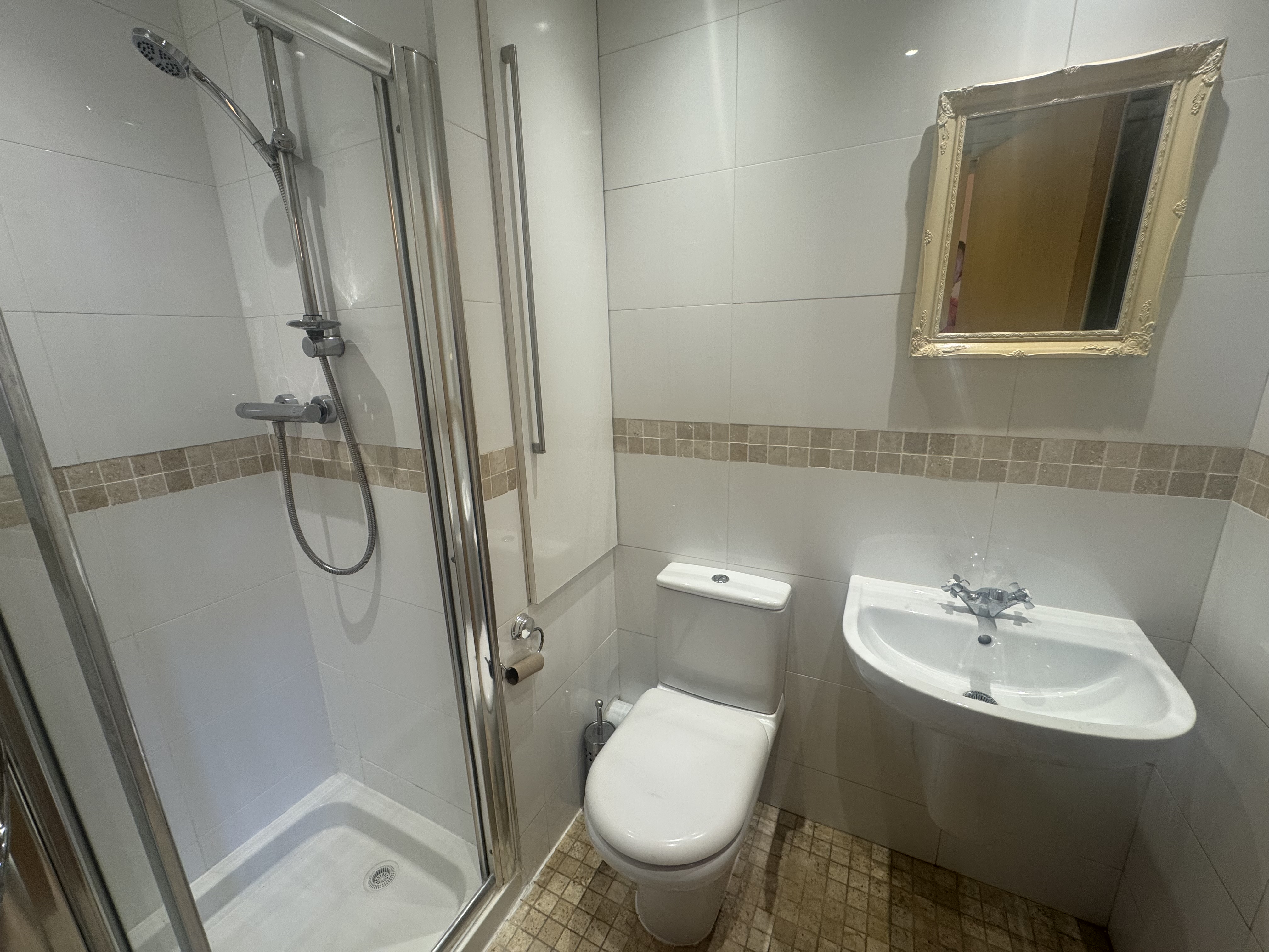 Shower Room. Walk in shower cubicle, WC, wash hand basin.