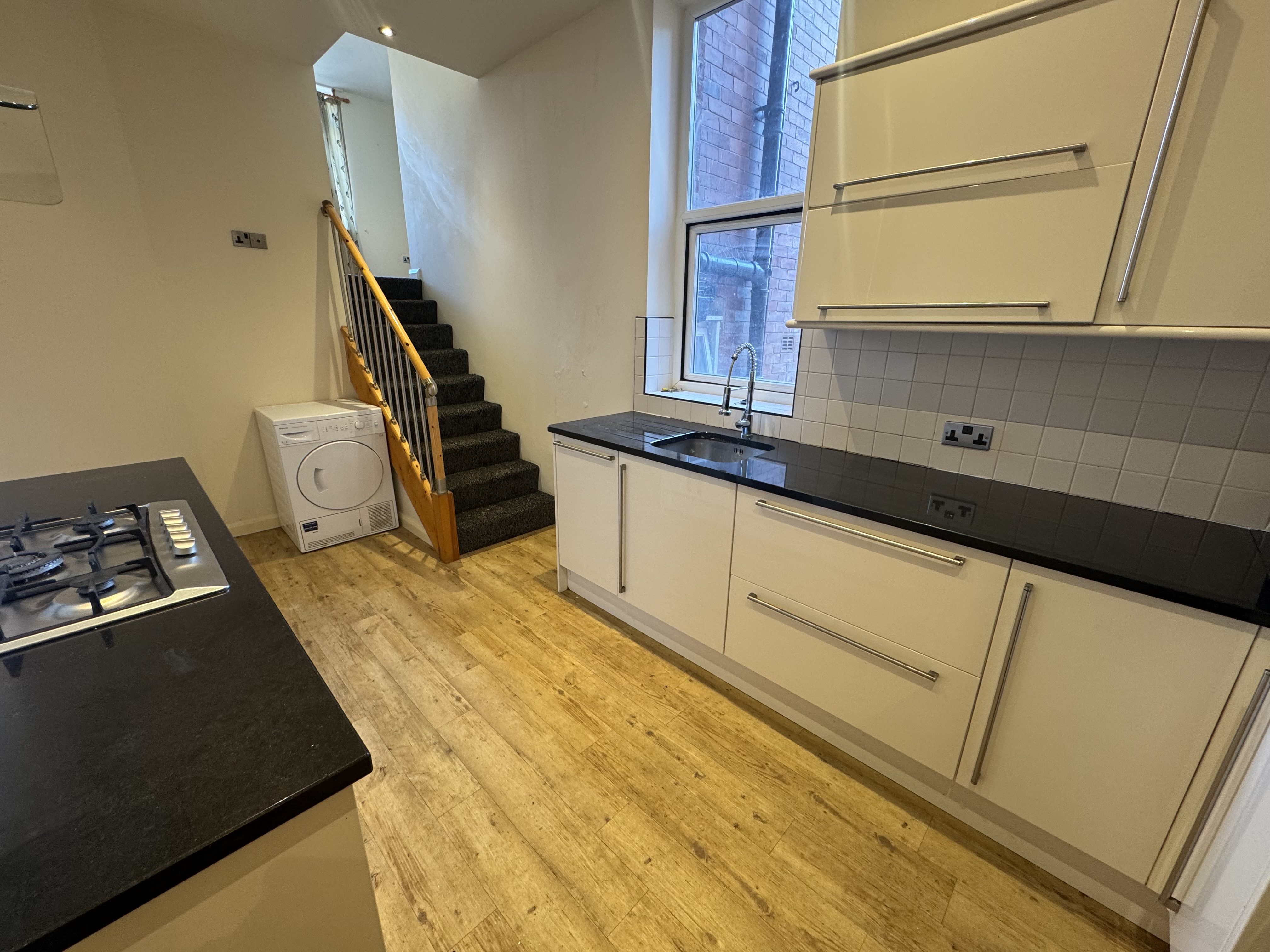 Kitchen. 5.00m x 2.60m, UPVC window, radiator, range of wall and base units, electric oven and gas hob, sink unit, stairs to :-